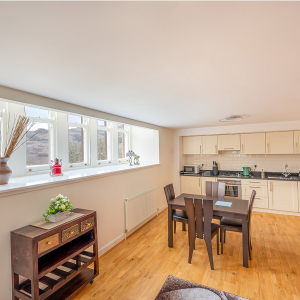 Stay in the charming village of Fort Augustus for a glorious break in the Scottish Highlands. Abbey Holidays Loch Ness is proud to offer this single-bedroom luxury holiday apartment. The bright and modern apartment is situated in the Monastery building of the historic St Benedict’s Abbey. This apartment offers stunning Loch Ness views – perfect for enjoying as you relax. It has an open-plan living room, kitchen and dining area. There is plenty of room to plan out your Highland adventure. Please note that access is by four flights of steps only – there is no lift in our historic building.